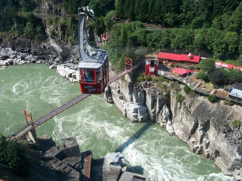 Hells Gate is an abrupt narrowing of British Columbia's Fraser River, located immediately downstream of Boston Bar in the southern Fraser Canyon. The towering rock walls of the Fraser River plunge toward each other forcing the waters through a passage only 35 metres (115 ft) wide. It is also the name of the rural locality at the same location.